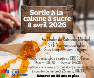 Départ du CRC St-Donat: 10h00. Veuillez être là au moins 15 minutes à l’avance.